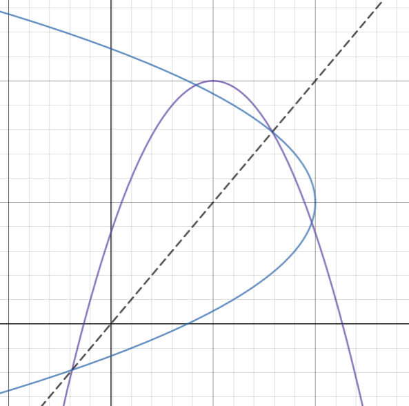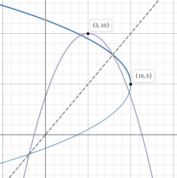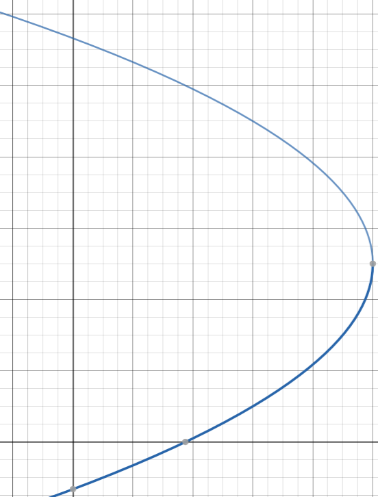 According to the properties of inverses, this is the inverse of the original parabola. It's symmetric over y=x and the points on this curve are the inverses of the points on the original parabola. The last thing we need to do is check that it is a function.