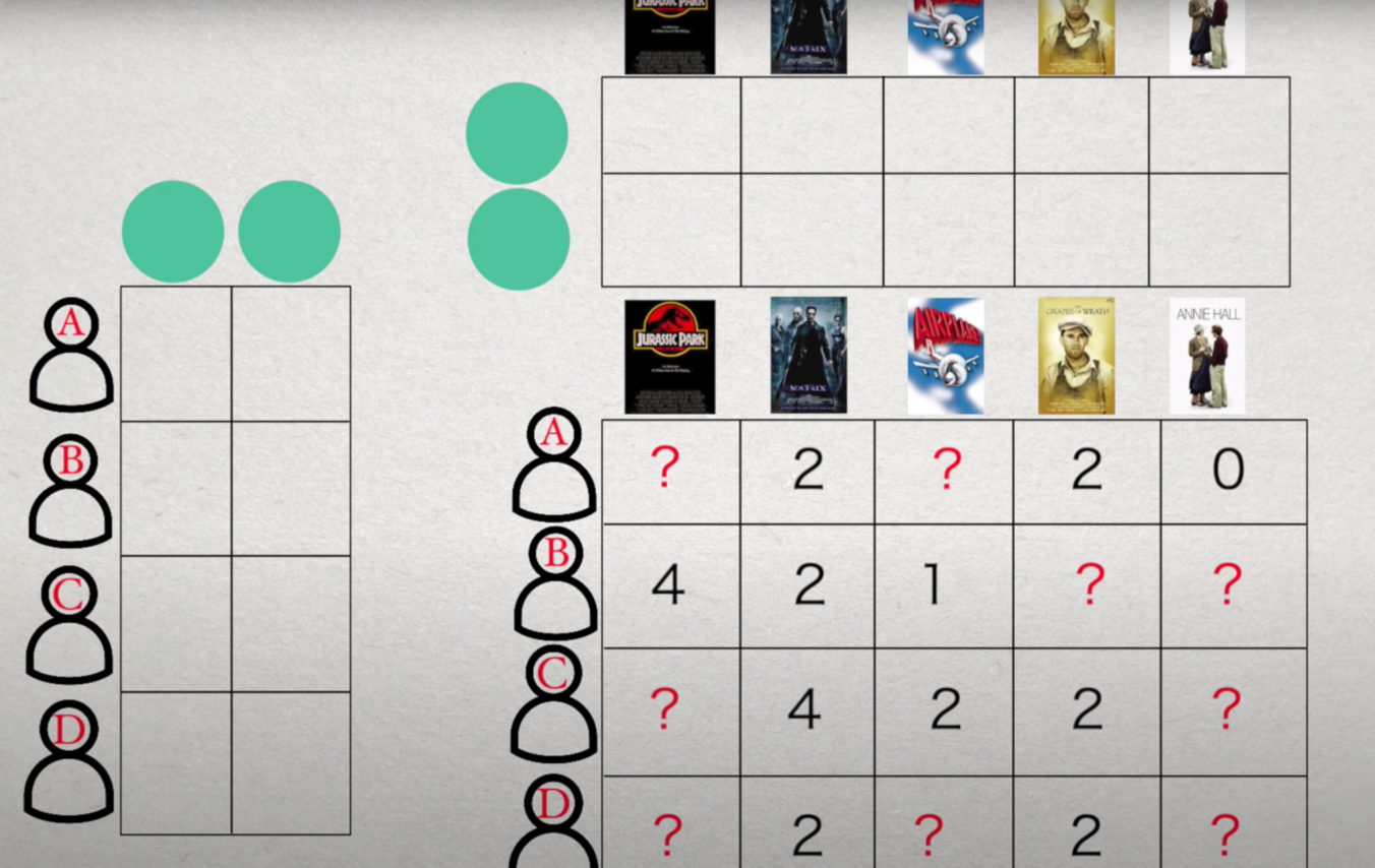 However, this process is slightly different from what we did above. The company running the streaming service doesn't know what its users' tastes are. It does know what movies they have watched, and whether they liked them or not. From this information they attempt to figure out each user's possible genre preferences using a process called matrix factorisation. Much like in