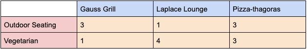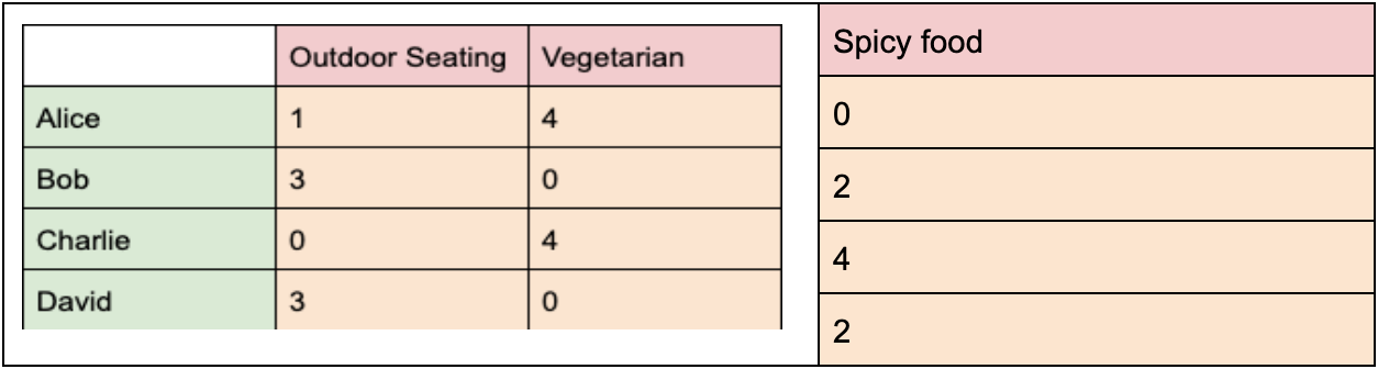 Each friend has preferences for how important these things are, which we can quantify with a value 0 (not important) to 4 (very important). If we create a table with friends on the left-most column and restaurant features across the top row, we can fill in the cells of the table with each friend's preference for that feature.