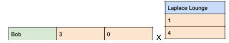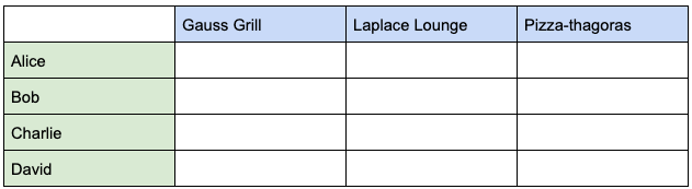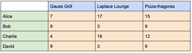 When we finish our process, we get a matrix of 4 rows and 3 columns. This makes sense! We had 4 people and 3 restaurants, so we will end up with a row for each person and a column for each restaurant.