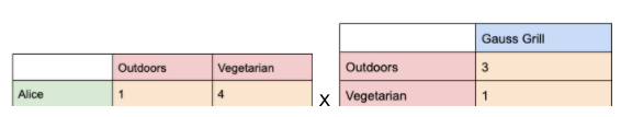 Alice has a preference of 4 for Vegetarian food, but Gauss Grill only has a value of 1 for Vegetarian food, and we mutiply these to get