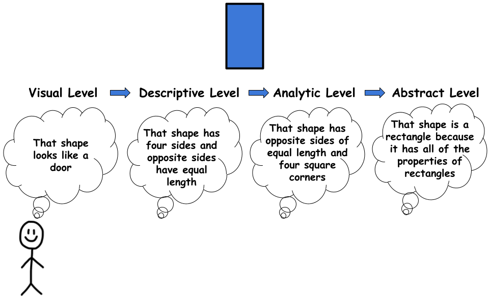 There are four levels of geometric thinking that students progress through in K–5. In earlier grades, students describe, compare, and sort two-dimensional shapes. This work is known as the visual and descriptive levels. In third grade, they apply their understandings in more analytic and abstract ways.