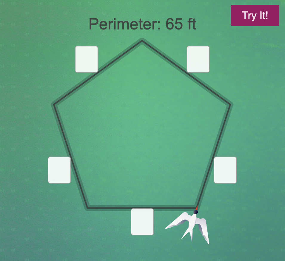 (3) Students use the geometric attributes of shapes to find perimeter more efficiently (by recognizing sides that are the same length and using multiplication).