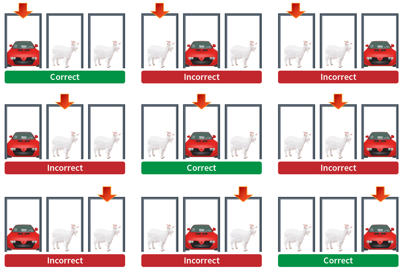 A great choice, but let me make life a little easier for you. I’ll open one of the other doors with a goat, so that there are only two doors left for you to pick from. Do you want to stick with your choice, or do you want to swap?